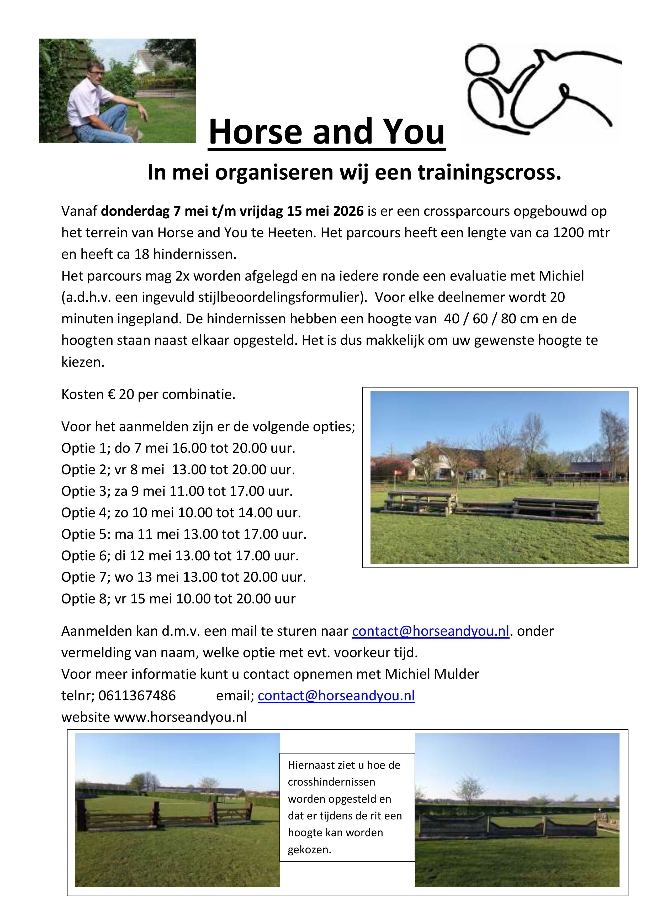 In de maand mei is er weer een trainingscross uitgezet op het terrein van Horse and You te Heeten. Zoals gebruikelijk staan de hoogtes 40/60/80 cm naast elkaar en kan er tijdens het rijden van het parcours gekozen worden welke hoogte men wil springen, niks moet alles kan, is ons motto. Het parcours wordt onder toezicht van Michiel verreden en elke deelnemer krijgt een evaluatie a.d.h.v. het stijlbeoordelingsformulier. Voor meer informatie zie onze flyer. Voor vragen mag u ons altijd bellen.